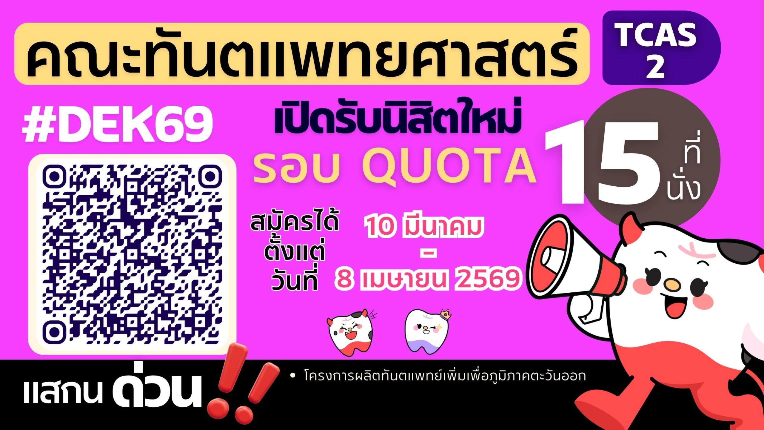 TCAS 2 โครงการผลิตทันตแพทย์เพิ่มเพื่อภูมิภาคตะวันออก จำนวน 15 คน